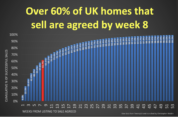 41.8% of all UK house sales take place in the first 4 weeks of the home being marketed and that rises to 61.7% of sales within 8 weeks. If you get to week 12 unsold, you only have a 14.5% chance of selling your home.