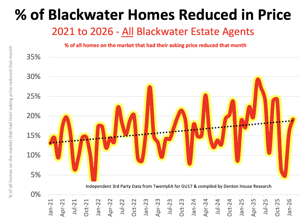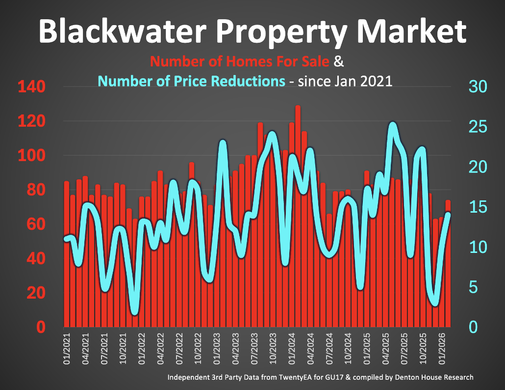 · 12 of the 68 properties each month in Blackwater during 2026 reduced their asking prices, an overall reduction rate of 17.5%