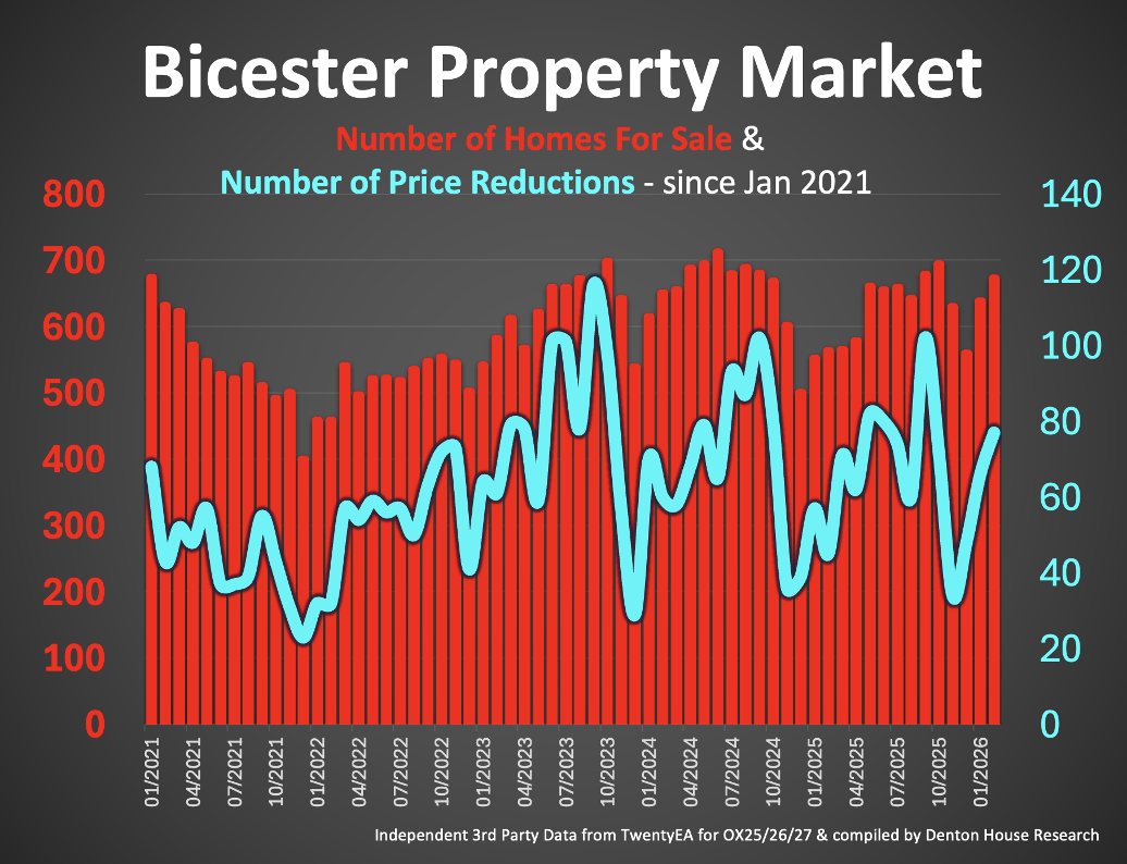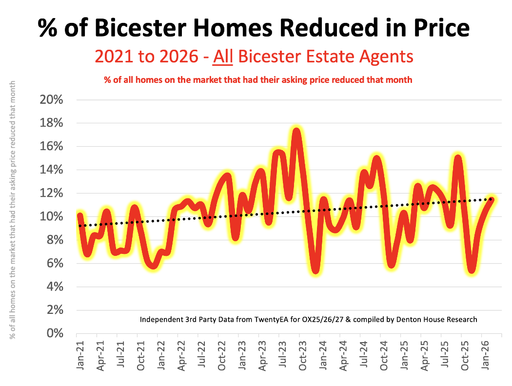 · 72 of the 656 properties each month in Bicester during 2026 reduced their asking prices, an overall reduction rate of 10.9%