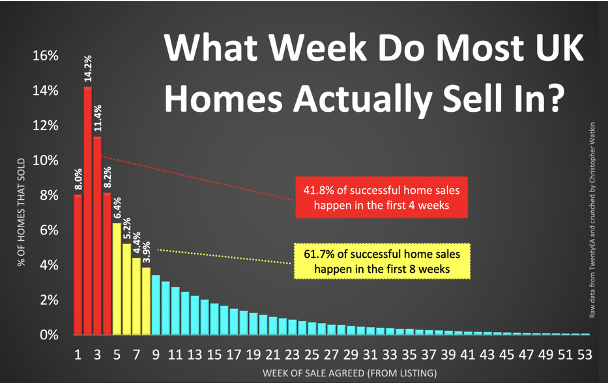 41.8% of all UK house sales take place in the first 4 weeks of the home being marketed and that rises to 61.7% of sales within 8 weeks. If you get to week 12 unsold, you only have a 14.5% chance of selling your home.