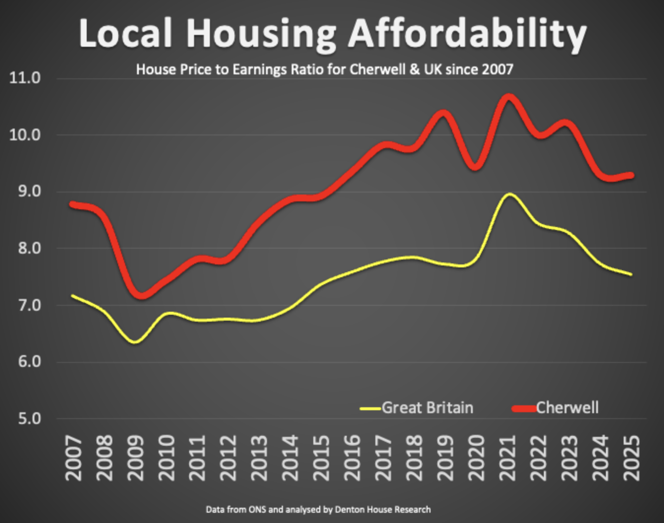 Between 2007 and 2014, the average in Cherwell was 8.1 times the average earnings. It reached 10.7 in 2021 and now stands at 9.3.