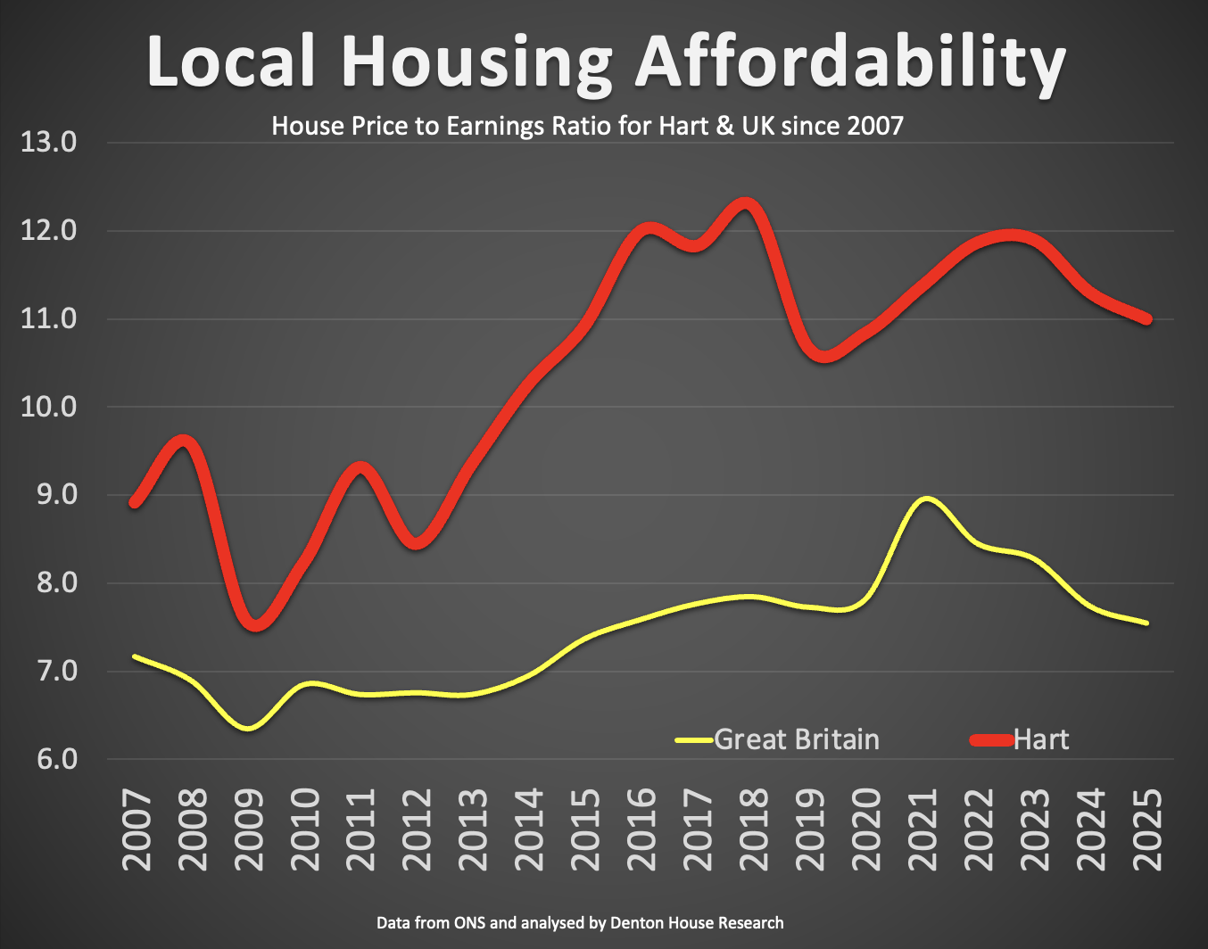 Between 2007 and 2014, the average in Hart was 9.0 times the average earnings. It reached 11.4 in 2021 and now stands at 11.0.