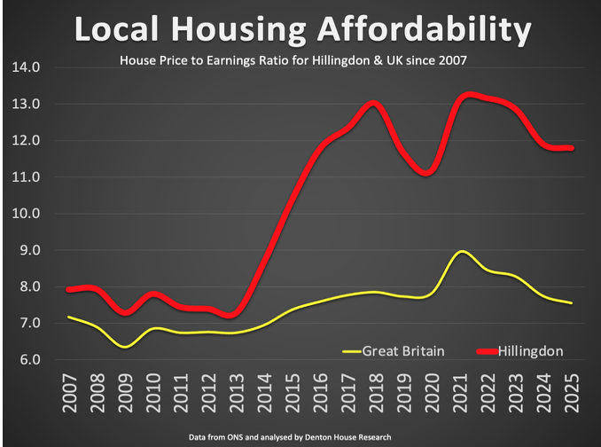 Between 2007 and 2014, the average in Hillingdon was 7.7 times the average earnings. It reached 13.2 in 2022 and now stands at 11.8.