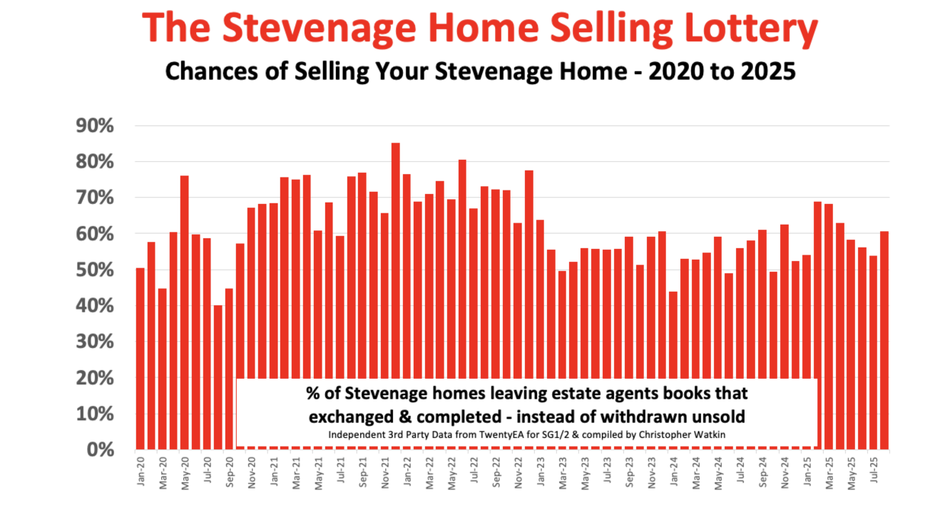 - Of the 1,463 Stevenage properties that left estate agents’ books in 2025 (so far), 60.6% exchanged and completed. The other 39.4% of homeowners, a total of 576 homes, withdrew from the market unsold.