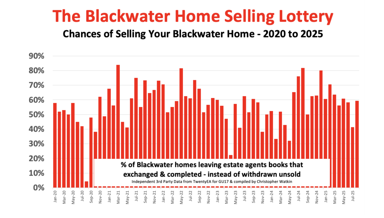 - Of the 186 Blackwater properties that left estate agents’ books in 2025 (so far), 58.1% exchanged and completed. The other 41.9% of homeowners, a total of 78 homes, withdrew from the market unsold.