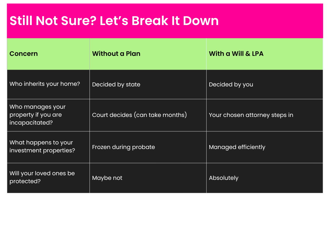 A Will and Lasting Powers of Attorney (LPA) make sure your home, savings, and investments are handled exactly as you intend — protecting both your family and your property.